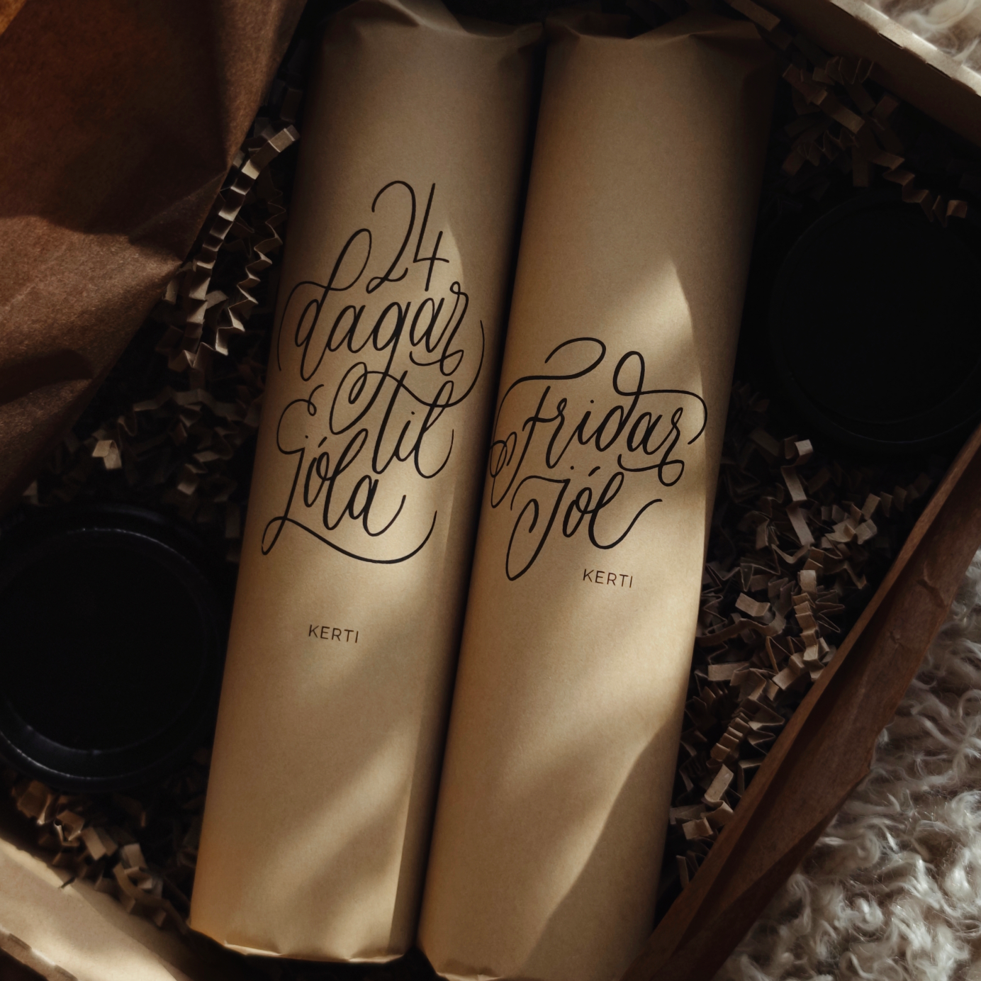 Kertið er fallega innpakkað í brúnann pappír sem gaman er að færa sem gjöf og eða hafa innpakkað sem skreytingu á heimilinu til 1. desember.