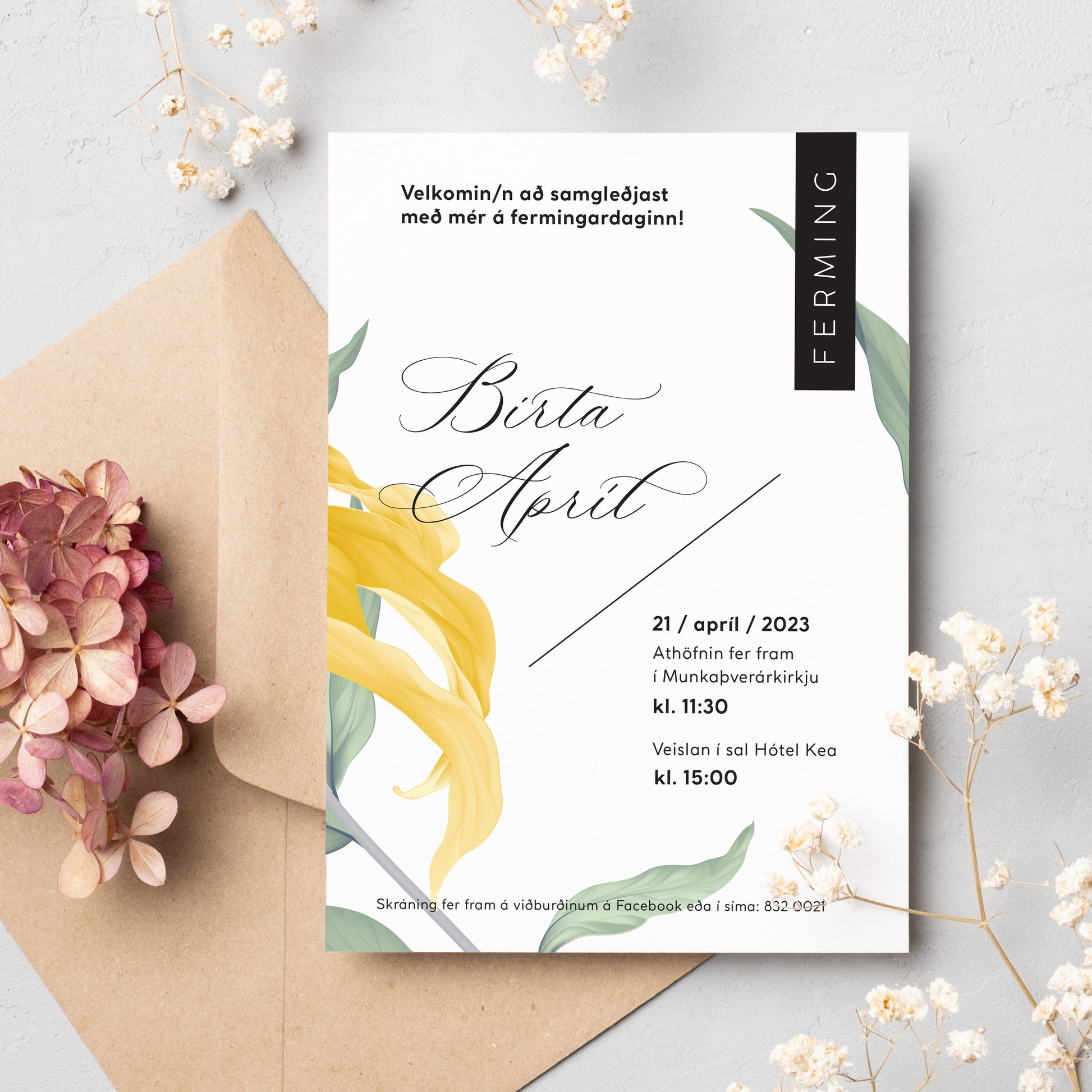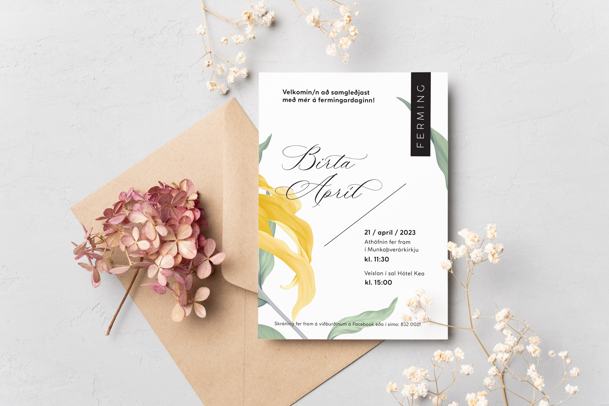Boðskort í stærð A5 - 14,8cm x 21cm, prentað á hágæða 300g pappír.