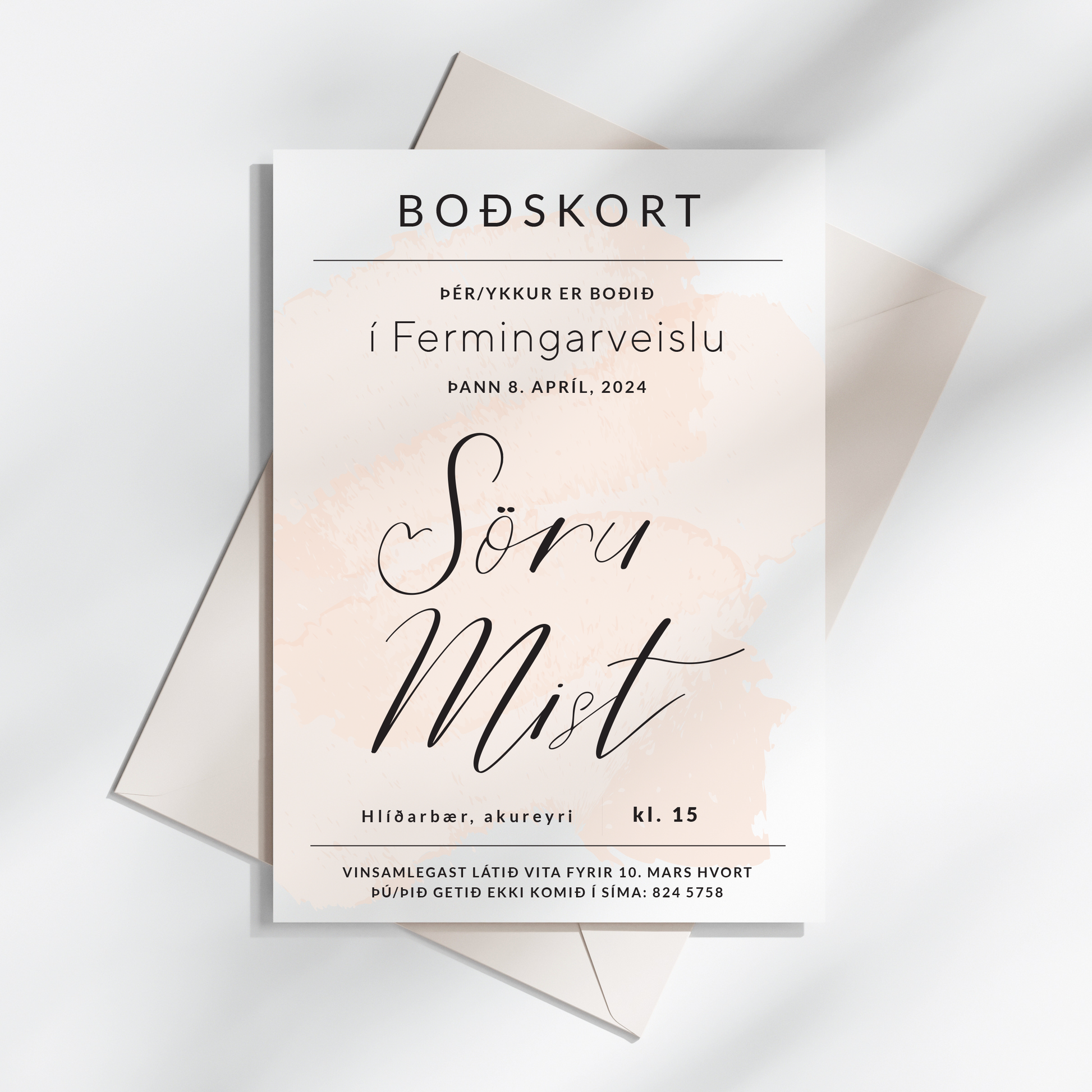 Boðskort í stærð 10 x 15 cm, prentað á hágæða 300g pappír.