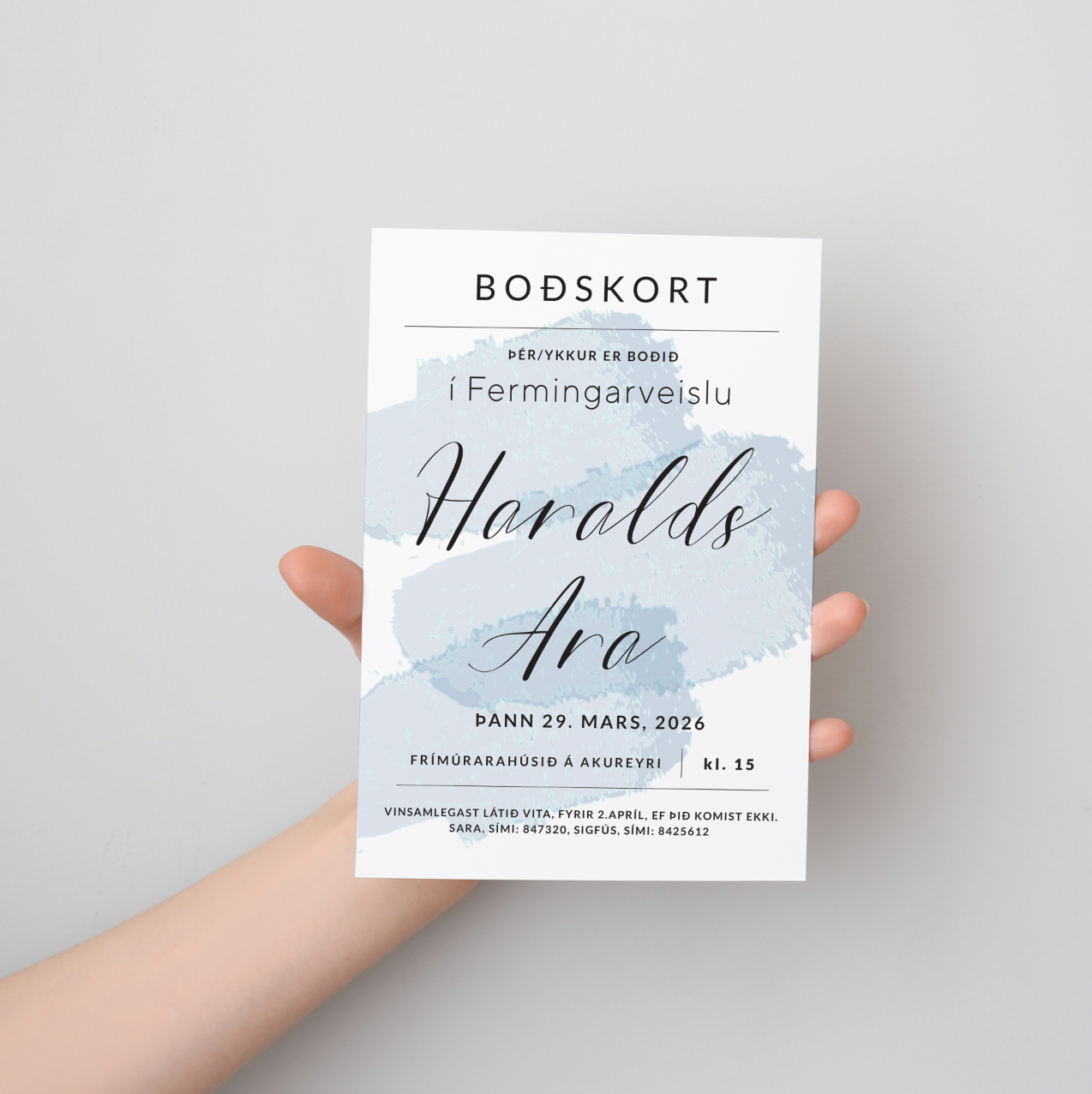 Boðskort í stærð A5 - 14,8cm x 21cm, prentað á hágæða 300g pappír.