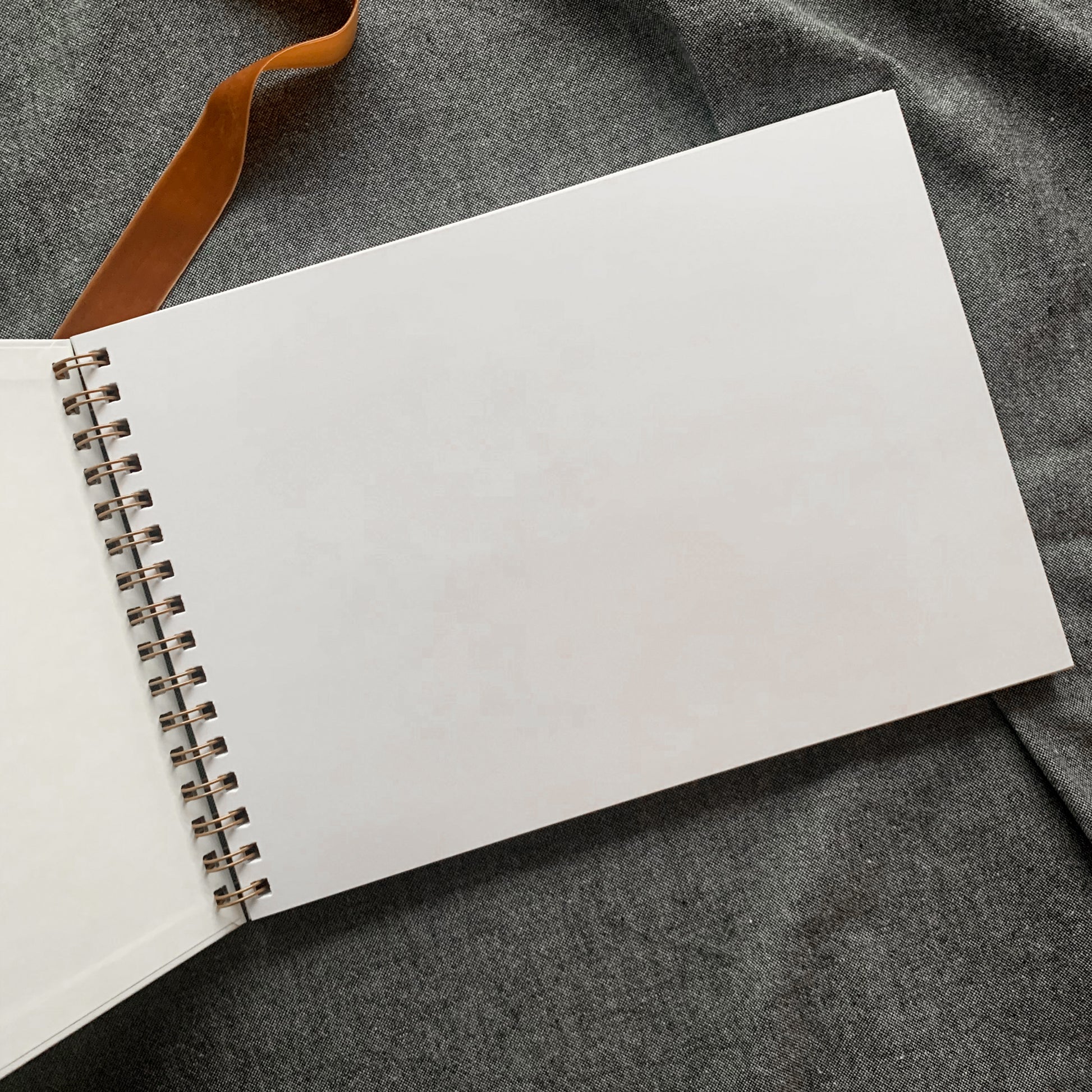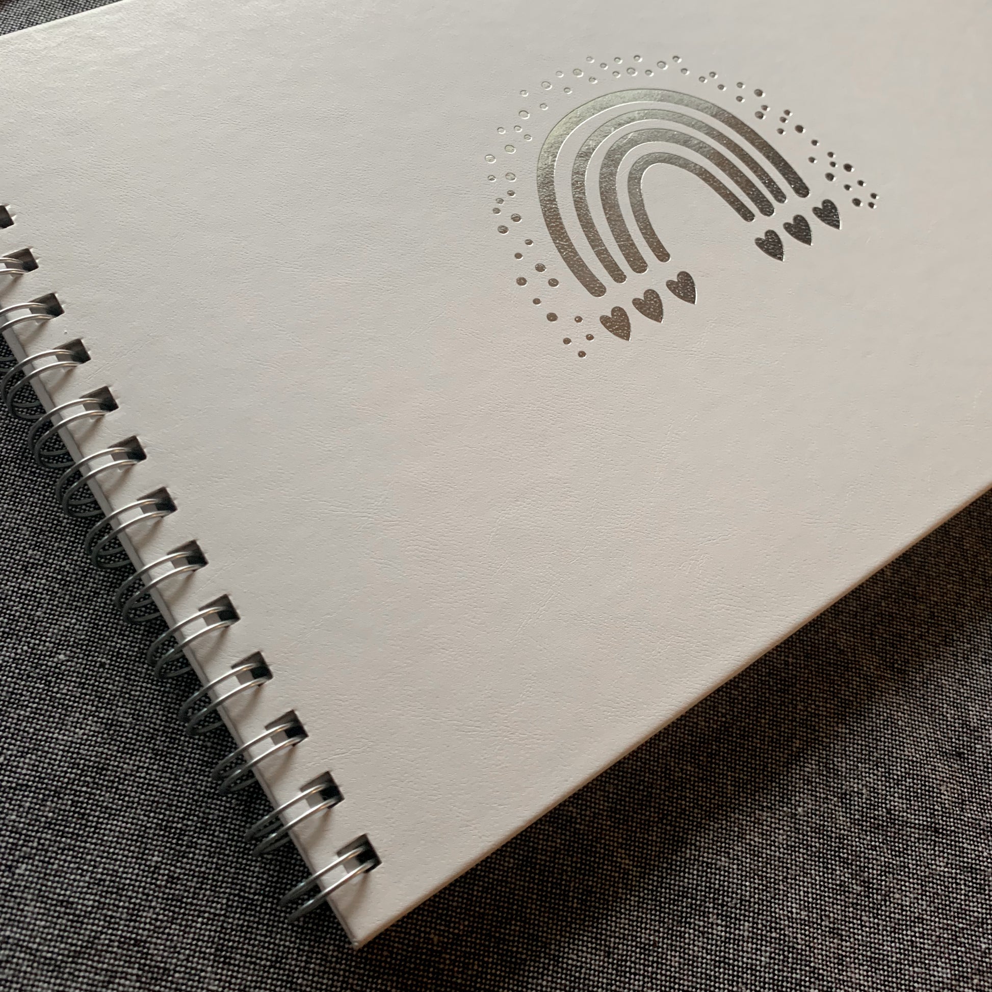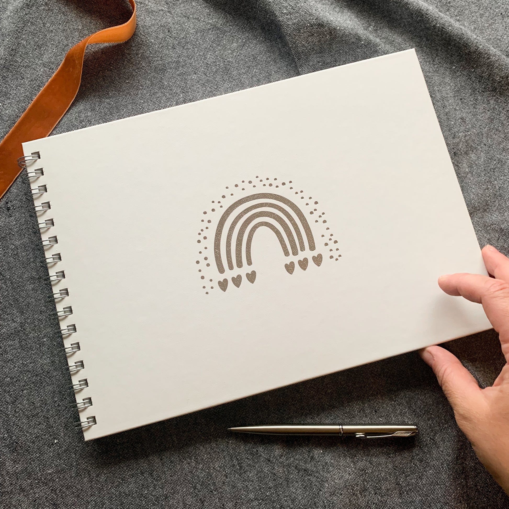 Harðspjalda gestabók með regnboga merkingu. Veldu lit á gyllingunni og hvort þið þurftið skrautritun á framstu blaðsíðu í Modern Calligraphy stíl